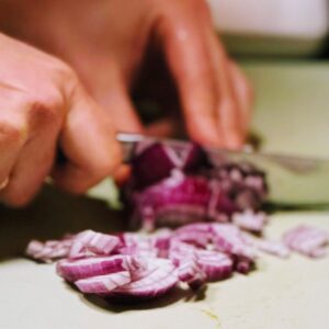 - Die roten Zwiebeln in Würfel schneiden, Knoblauch feinhacken. In der Zwischenzeit Reis (Tipp Kabuli Palau), Fladenbrot oder andere Beilage nach Wahl zubereiten.