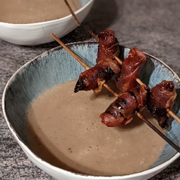 Cremig, nussig und perfekt für kalte Tage – diese Maronensuppe wärmt Herz und Seele. Für die vegetarische Variante einfach die Datteln im Parma-Schinken-Mantel weglassen.